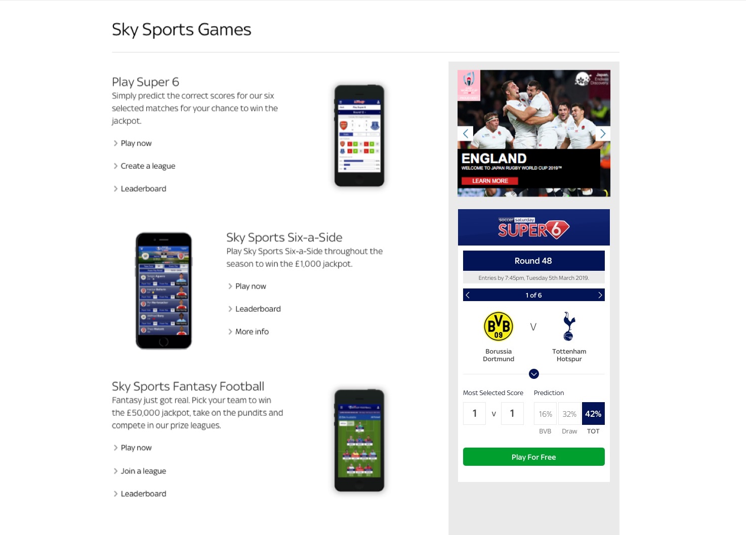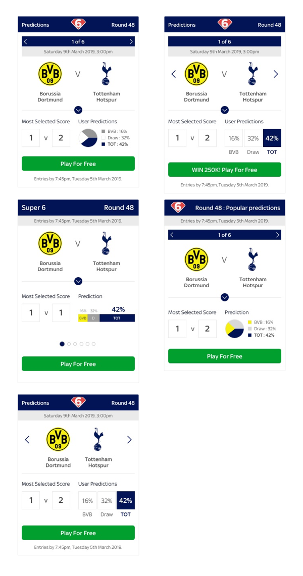 Super 6 Widget I was asked to design a widget for Sky Sports that would pull in Super 6 Gameplay functionality. The widget would sit on site and in the games section. Widget approved by Sky Bet.